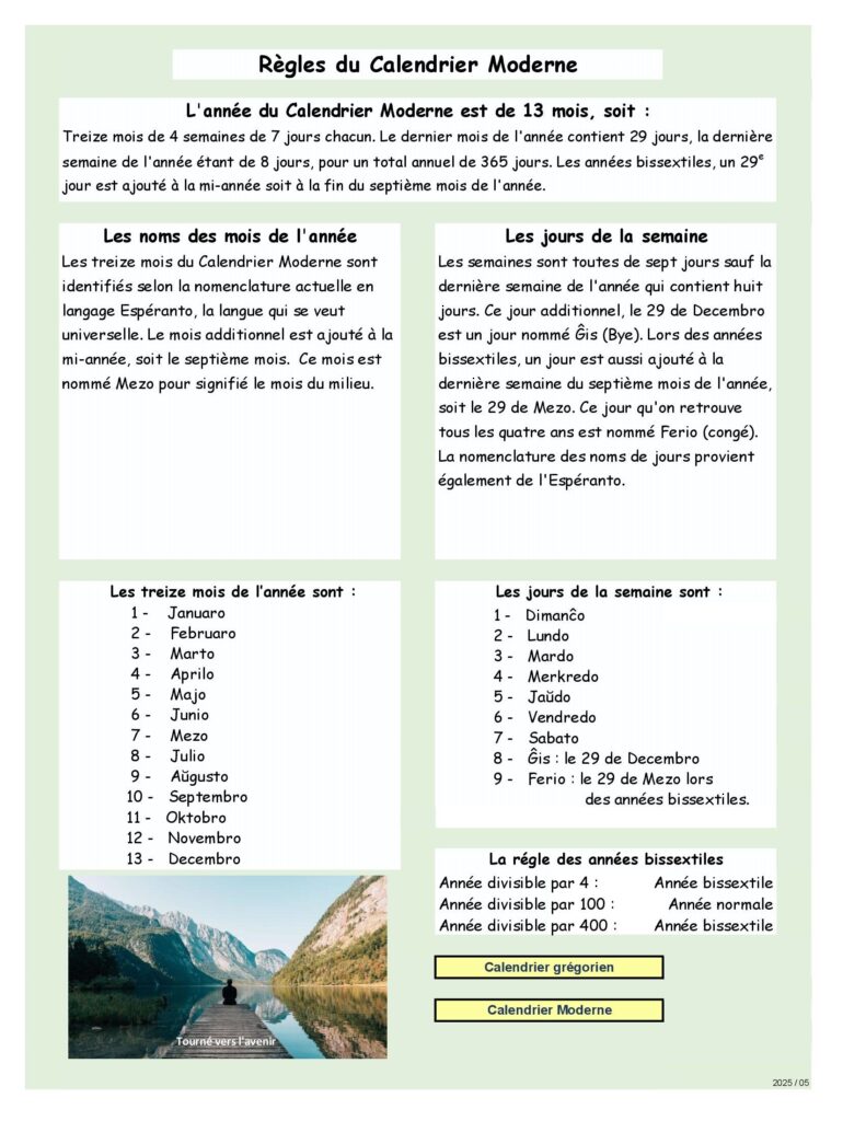 - Règles du Calendrier Moderne : Indique les règles régissant le Calendrier Moderne.